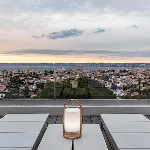 Cette lampe se distingue par son design moderne et scandinave avec sa poignée en bois naturel et épuré mais également par son autonomie de fonctionnement (jusqu’à 10h).