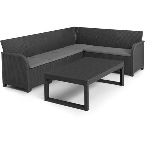 Cet agréable salon de jardin en résine de couleur gris foncé se compose d'une banquette d'angle 6 places et d'une table 2 positions (Up & Down).