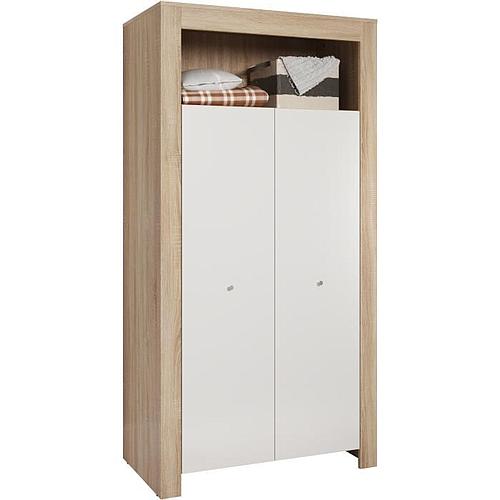 Une armoire 2 portes, avec 1 niche À l'intérieur 2 barres de penderie et 4 tablettes. Réalisée en panneau de particules mélaminés Chêne Sonoma et blanc mat.