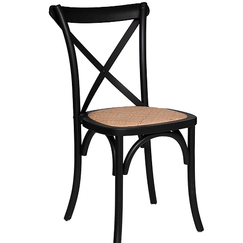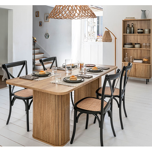 La table s'intègre parfaitement avec le métal, le verre et le velours, tandis que les chaises Isak apportent une touche vintage rustique avec leur structure en chêne et assise en rotin. Ensemble, ils créent une ambiance chic et accueillante.