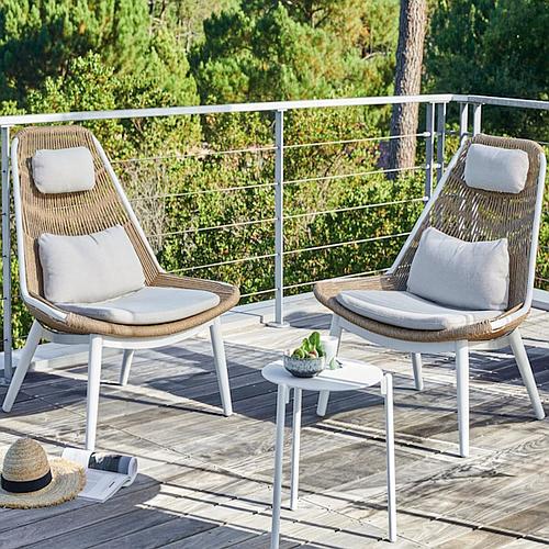 L'assise de la chaise est habillée de cordes rondes en résine synthétique, offrant un style authentique et une grande durabilité. Les coussins, recouverts d'un tissu polyester déhoussable et traité pour être déperlant, assurent un confort optimal. La mousse des coussins est dense, avec une densité de 25 kg/m³, garantissant ainsi un soutien agréable et durable.
