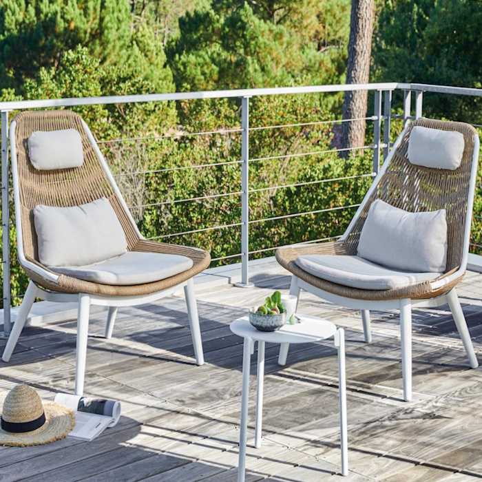 En blanc/écru, ce duo s'intègre facilement dans divers environnements extérieurs. Ses dimensions généreuses (93 cm de longueur, 84 cm de hauteur et 100 cm de profondeur) offrent un espace de détente spacieux.
