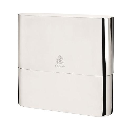 Signature et blason Christofle sur l'écrin en acier et sur la galette de bois
