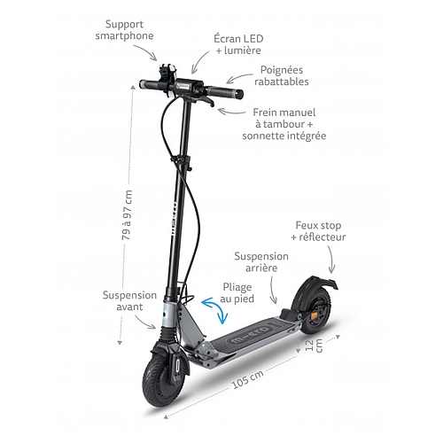 Son guidon, avec une sonnette intégrée, est réglable de 79 à 97 cm (en partant de la planche) et de 91 à 109 cm (en partant du sol).