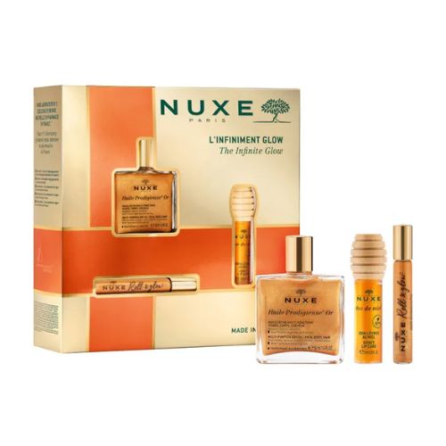Coffret Nuxe "L'Inifiniment Glow" et ses soins indispensables pour un éclat doré et une peau hydratée.