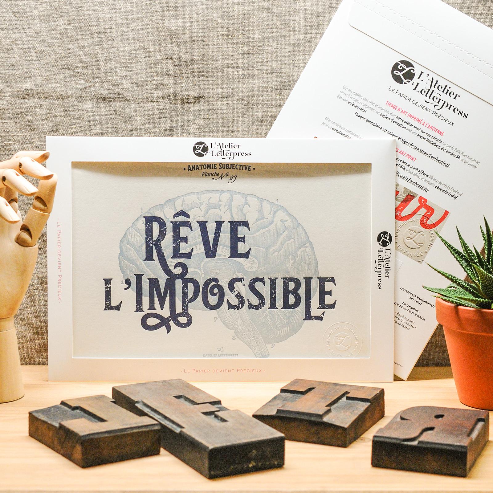 Magnifique affiche très graphique, illustrée d'une gravure vintage d'anatomie et de la phrase "Rêve l’Impossible". Magnifique affiche en impression à l'ancienne Letterpress, imprimée sur luxueux papier 100% coton. L'affiche est frappée d'un sceau d'authenticité, joliment présentée dans une belle pochette cartonnée, avec au dos des explications en français et en anglais du design et de notre technique d'impression.