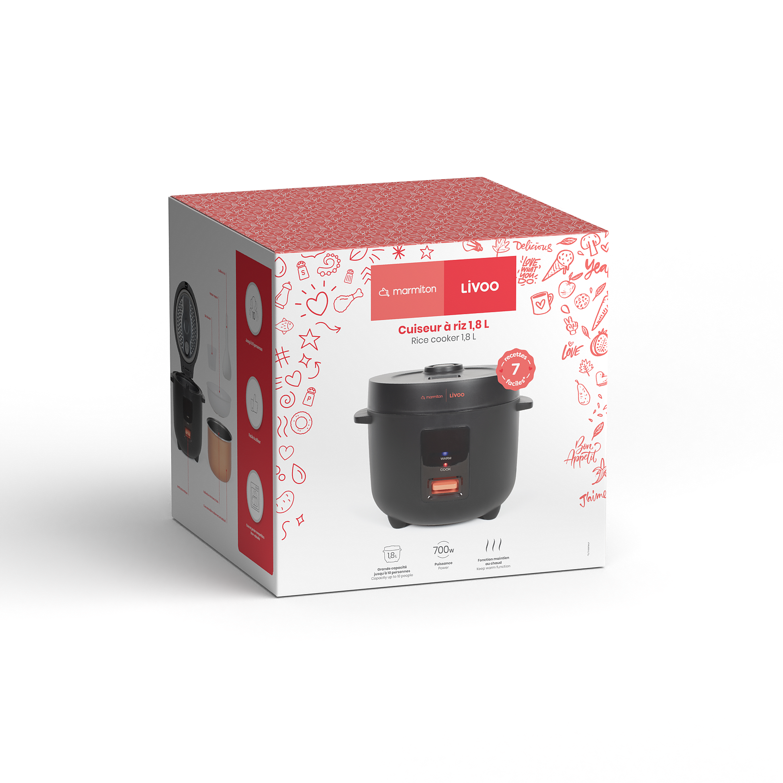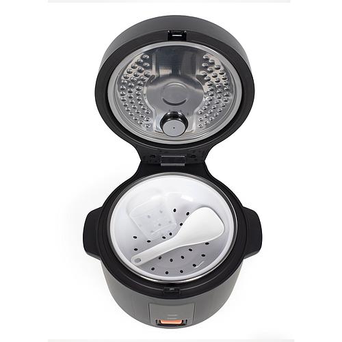 Ce modèle se distingue par sa cuve amovible antiadhésive, qui facilite le nettoyage, et ses accessoires inclus, tels qu'un verre doseur, une spatule à riz et un panier vapeur. Son design compact et élégant s'intègre facilement dans n'importe quelle cuisine, tandis que ses fonctionnalités, comme l'arrêt automatique et le maintien au chaud, assurent une utilisation pratique et sécurisée.