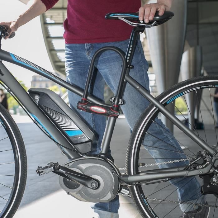 Ce modèle se distingue par ses caractéristiques avancées. L'anse à double verrouillage de 13 mm de diamètre garantit une sécurité renforcée, tandis que le cylindre à disque avec clé offre une protection supplémentaire contre le crochetage. Le revêtement en vinyle protège l'antivol des intempéries, et la protection coulissante préserve le compartiment de la clé de la poussière et de l'humidité. Certifié dans plusieurs pays, il répond aux normes de sécurité les plus exigeantes, telles que Sold Secure Gold au Royaume-Uni et VDS Klasse A+ en Allemagne.