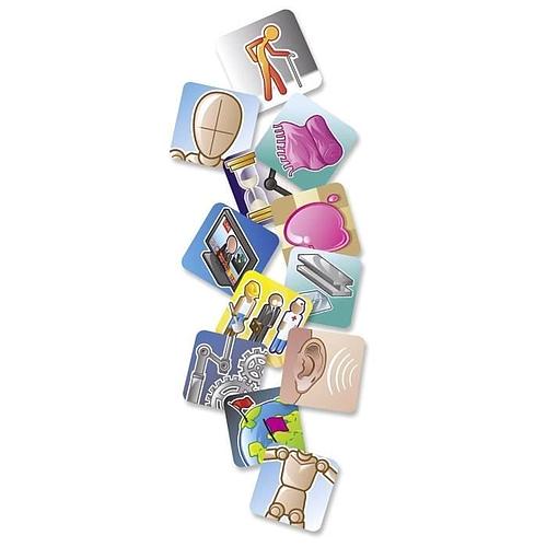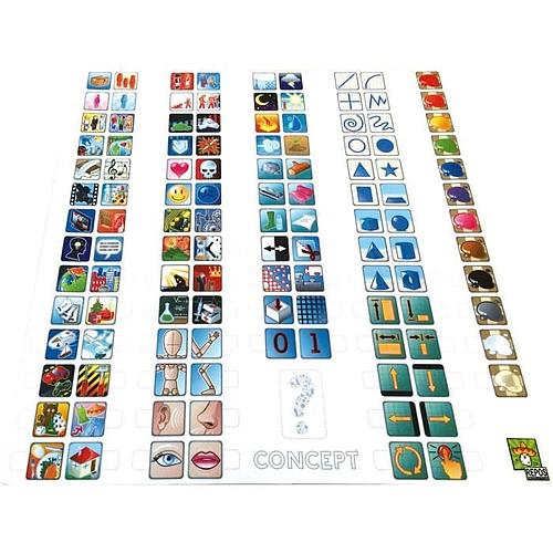 Contenu : 1 plateau d’icônes, 110 cartes Concept (3 niveaux de difficulté), pions, cubes, aides de jeu, jetons de score, bol de rangement