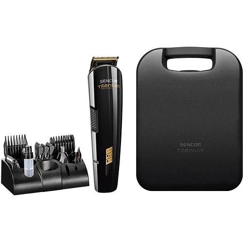 Accessoires inclus : Peignes de coupe (3/6/9/12 mm), Peignes pour barbe (4/6/8 mm), Tête de coupe pour nez et oreilles, Tête de coupe contour, Tête de coupe pleine largeur, Socle de rangement, Trousse de transport, Peigne, brosse de nettoyage, huile