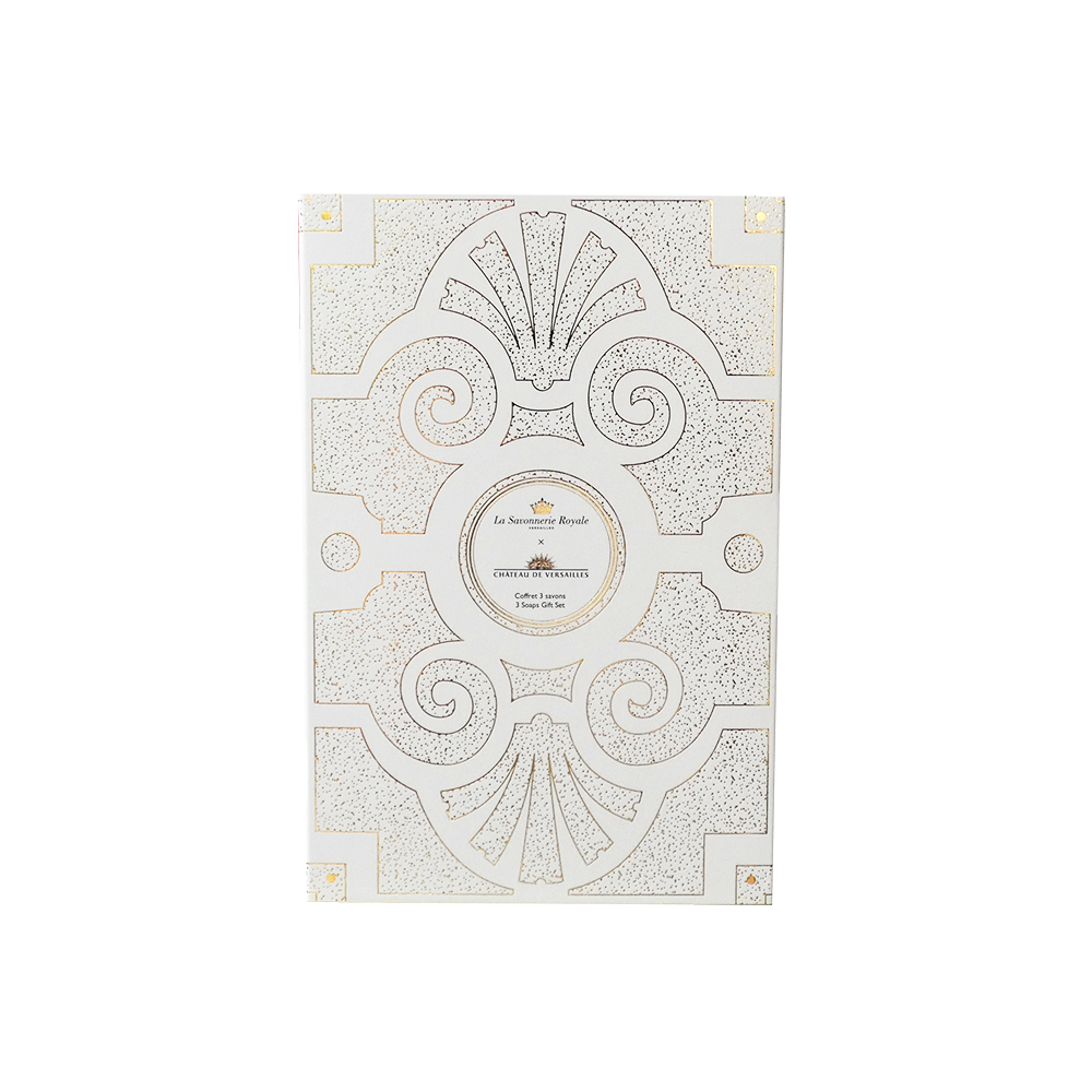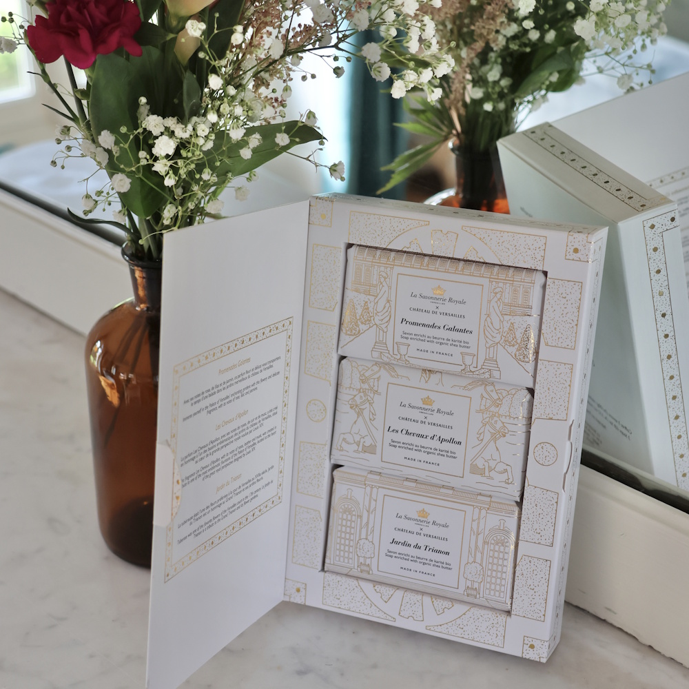 Ce coffret prestigieux est le fruit d’une collaboration entre La Savonnerie Royale et le Château de Versailles. Il réunit trois savons naturels de 100 g chacun, enrichis en beurre de karité bio, et inspirés des jardins et de l’art de vivre à la cour de Louis XIV. Chaque savon est orné d’une fleur de lys en relief, symbole royal, et présenté dans un écrin élégant fabriqué en France, reflet du savoir-faire artisanal et du patrimoine français.