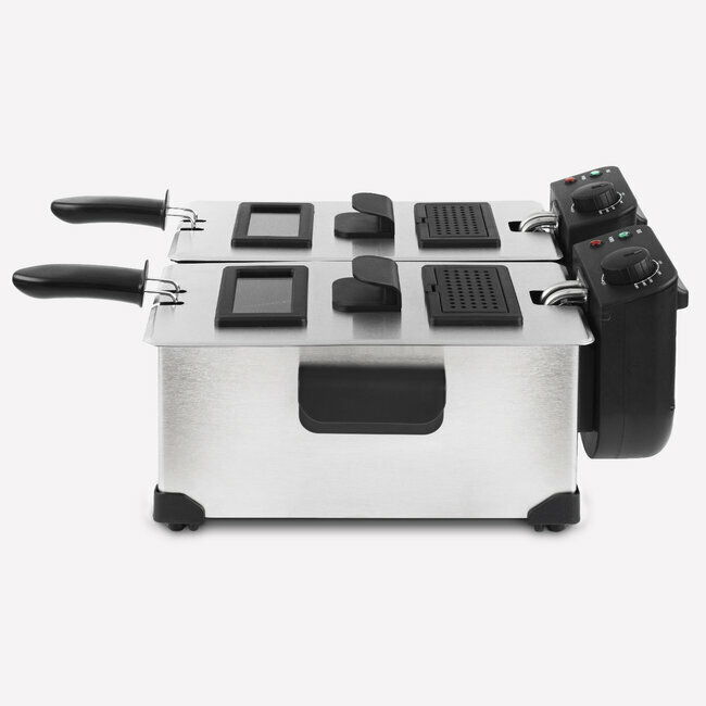 Avec une capacité totale de 6L, chaque cuve possède chacun un thermostat indépendant permettant de régler la température jusqu’à 190°C. Vous pouvez ainsi offrir deux bains de cuisson à vos frites, ou encore cuire simultanément deux aliments différents pour gagner du temps.