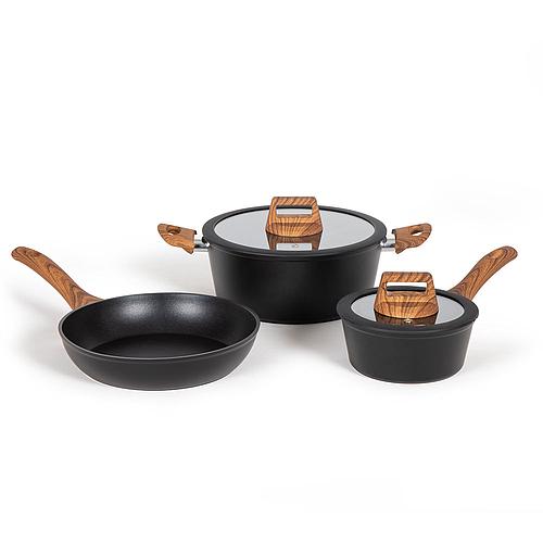 Cette batterie de cuisine est composée d'une casserole avec couvercle Ø 16 x 7 cm, 1 poêle Ø 24 x 5 cm et 1 faitout avec couvercle Ø 24 x 10 cm.