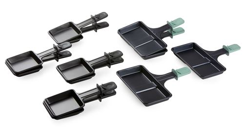 Accessories included: 8 small raclette pans and 4 xl raclette pans with non-stick coating.