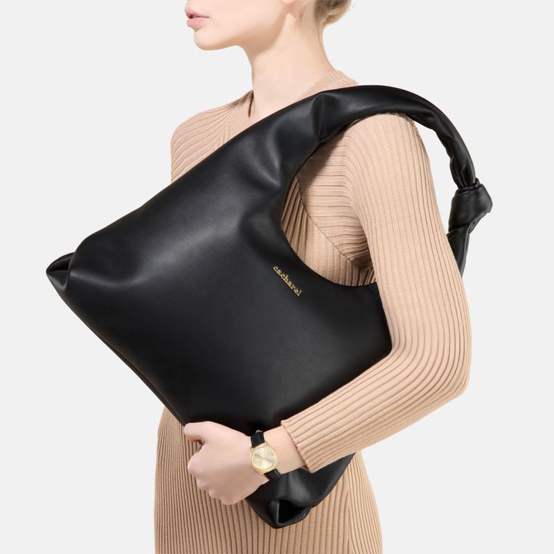 Confectionné en cuir végétalien mat, il offre une texture douce au toucher et une finition soignée, tout en respectant vos engagements éthiques. Sa forme bouffante et sa poignée nouée intégrée apportent une touche de modernité et de confort, tandis que la plaque dorée “C” discrètement apposée à l’arrière ajoute une note luxueuse sans ostentation.