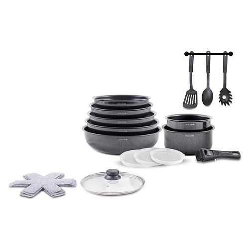 Ce set inclut 3 poêles de 20, 22 et 26 cm, 2 casseroles de 16 et 18 cm, une sauteuse de 24 cm, un wok de 28 cm, un couvercle en verre de 24 cm, 3 couvercles hermétiques de 16, 18 et 24 cm, 3 ustensiles en nylon, 3 proteges poeles, et une poignée amovible.