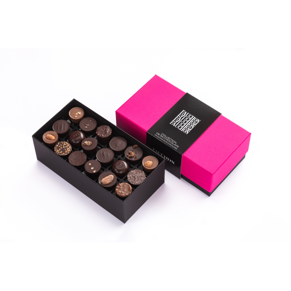Écrin de 54 chocolats pour une dégustation de l'excellence Fauchon. Une collection de chocolats qui exaltent les saveurs intenses du cacao. Les enrobages subtils de chocolat noir et de chocolat au lait révèlent des textures gourmandes comme le croquant du praliné, le fondant des ganaches ou l'onctuosité du caramel.