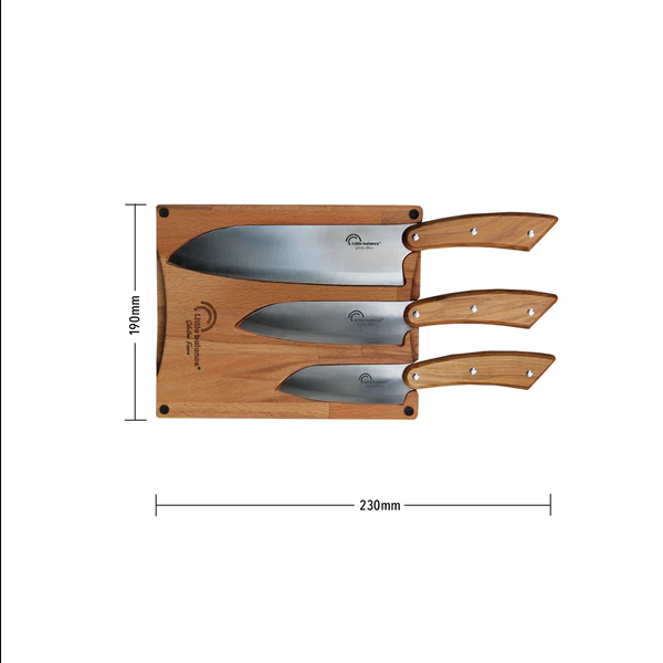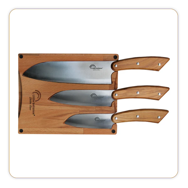 Planche à découper en hêtre pour 2 utilisations : D'un côté, empreintes aimantées pour ranger les 3 couteaux, en toute sécurité - De l'autre côté, c'est une planche à découper