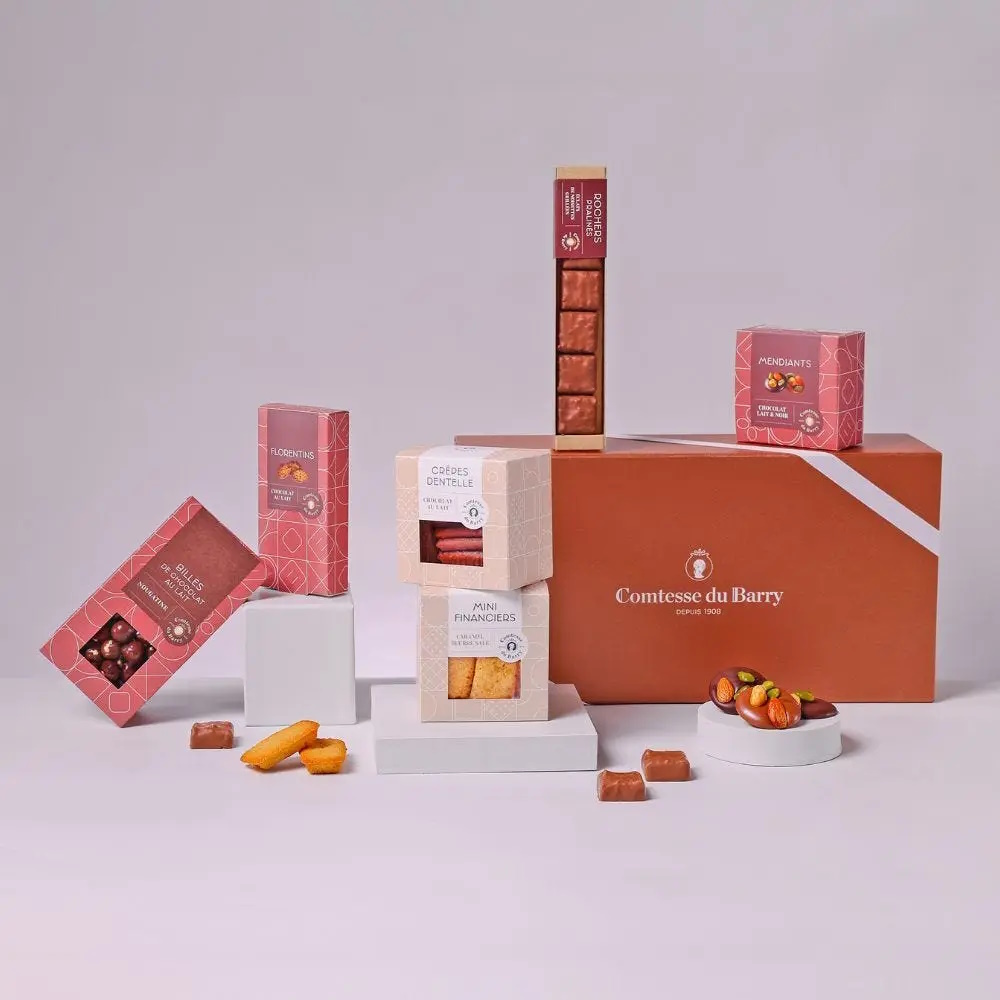 Dans son élégant coffret terracotta, ce coffret éclats gourmands Comtesse du Barry dévoile un assortiment raffiné de douceurs artisanales, pensées pour éveiller les sens. Chaque bouchée est une promesse de plaisir : des florentins au chocolat au lait aux mini financiers au caramel beurre salé, en passant par les crêpes dentelle croustillantes et les mendiants chocolatés, ce coffret est une véritable ode à la gourmandise. Idéal pour les fêtes, les remerciements ou les moments de partage, il incarne l’art de faire plaisir avec délicatesse.