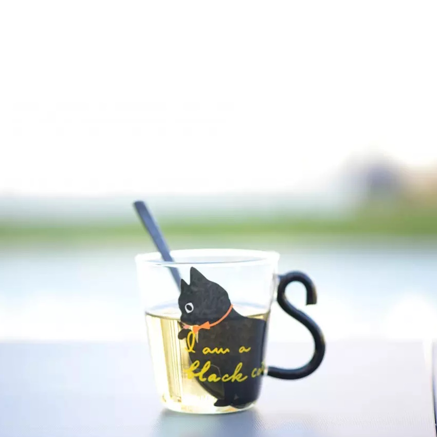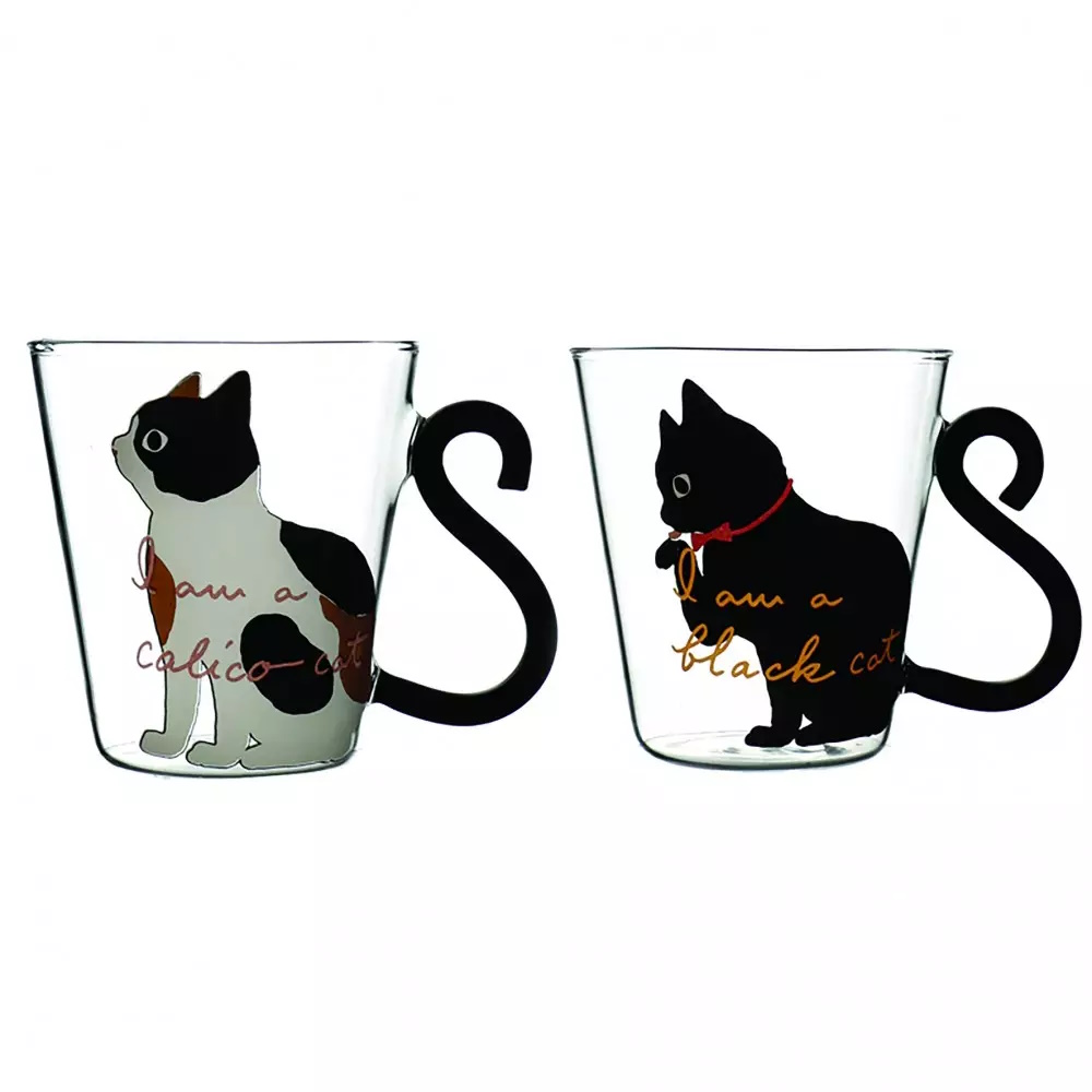Buvez votre café, ou votre thé avec ce ravissant set de deux tasses en verre transparent avec impression et queue de chat.