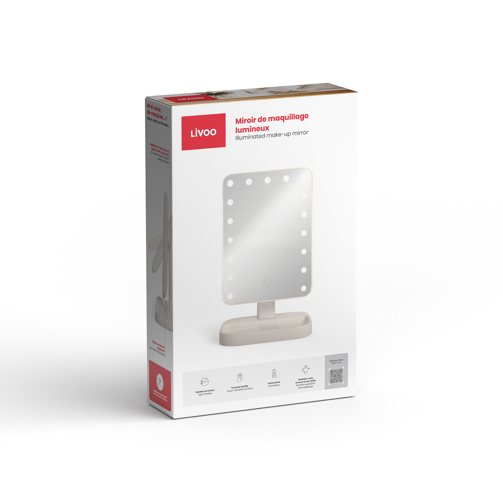 Le design raffiné et pratique de ce miroir s'intègre facilement dans n'importe quel intérieur. Son boîtier en bois clair et son écran noir brillant apportent une touche d'élégance moderne à votre espace de beauté.
