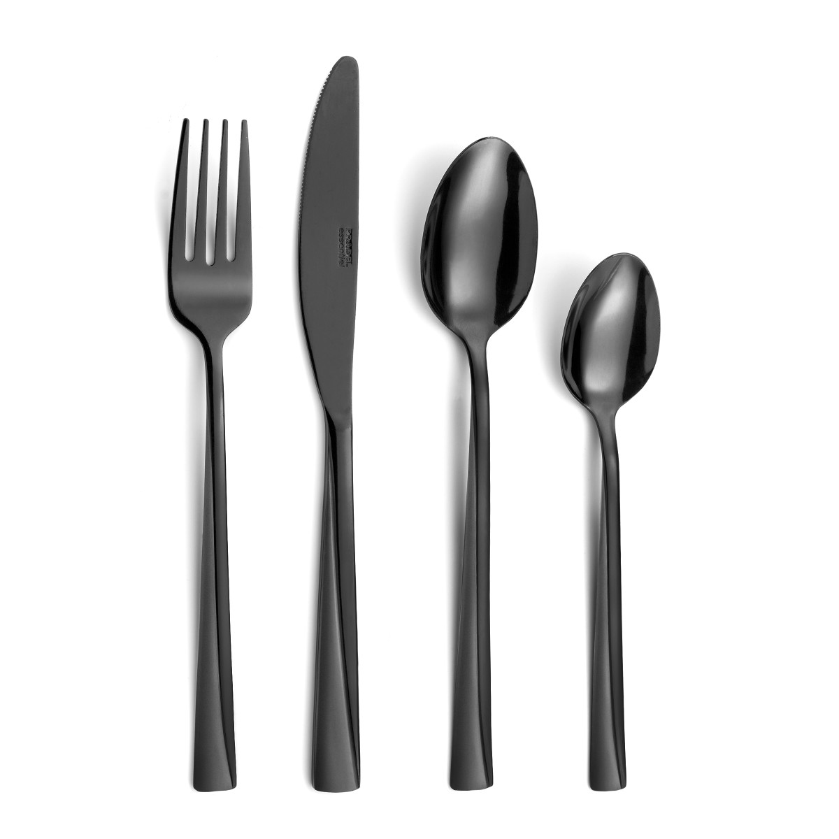 Ce service est composé de 4 fourchettes, 4 couteaux, 4 cuillères à soupe et 4 cuillères à café, parfaitement équilibrés pour une prise en main confortable. Chaque pièce est pensée pour allier durabilité et esthétique, avec des lignes épurées et une finition soignée. Le revêtement noir confère une allure audacieuse qui s’adapte à tous les styles de décoration.
