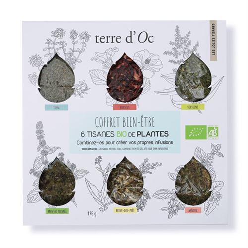 Ce coffret Terre d’Oc réunit six plantes issues de l’agriculture biologique, sélectionnées pour leurs vertus naturelles et leurs saveurs délicates : thym, hibiscus, verveine, menthe poivrée, reine-des-prés et mélisse.