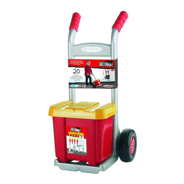 Pour que votre petit bricoleur, ou petite bricoleuse puisse vous accompagner dans vos travaux, voici un diable avec une boite à outils contenant 20 accessoires pour bricoler.