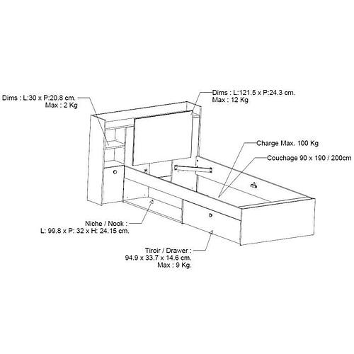 L’un des atouts majeurs de ce lit réside dans ses rangements astucieusement intégrés. Les tiroirs spacieux offrent un espace organisé pour ranger les vêtements, les jouets et autres objets essentiels. Les niches et la porte ajoutent une dimension pour exposer les trésors préférés de votre enfant tout en maintenant l’ordre.