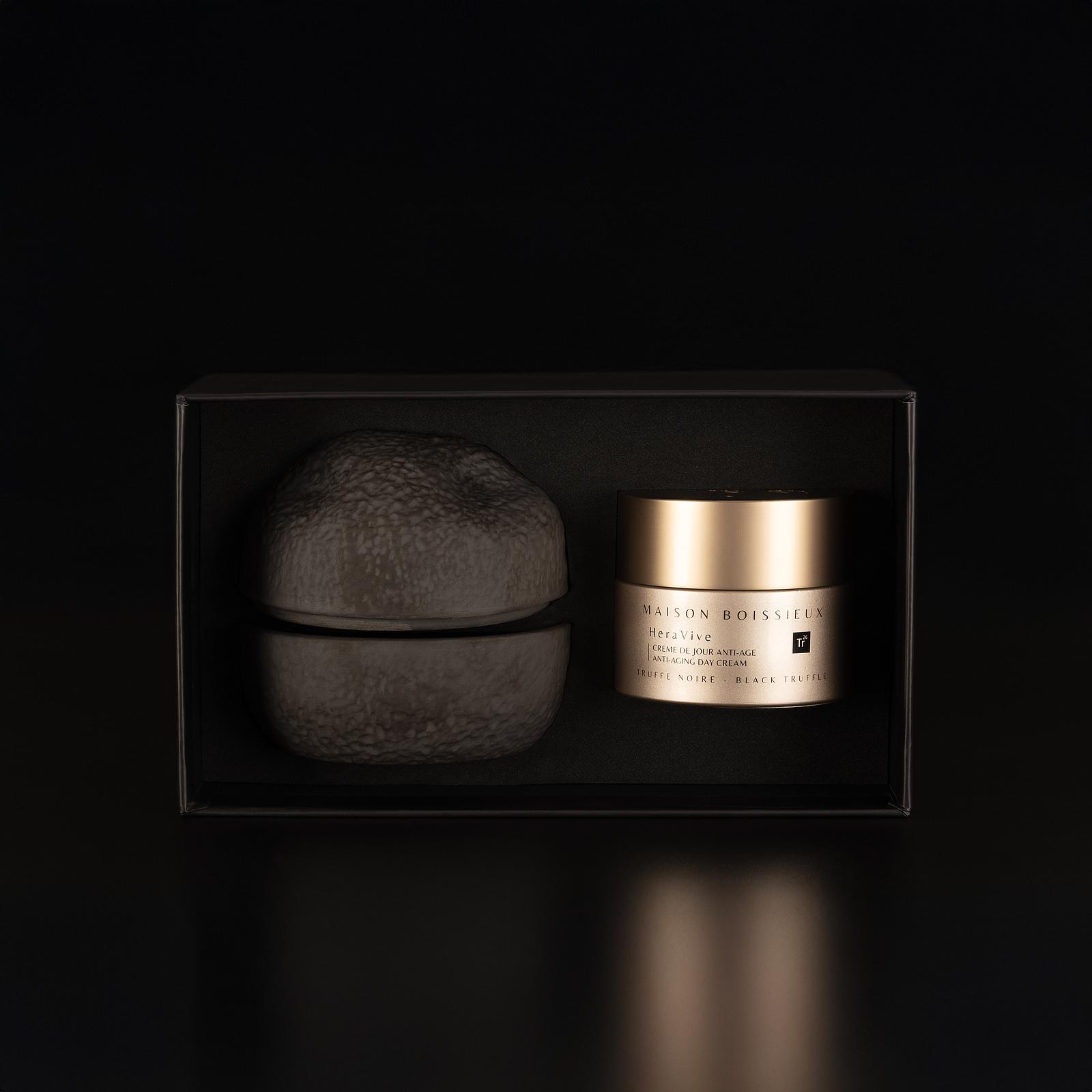 Plongez dans un univers d'élégance et de soin avec ce coffret raffiné qui célèbre à la fois la nature et l’artisanat. Il contient une crème de jour anti-âge d’exception, enrichie en truffe noire, reconnue pour ses vertus régénérantes. Ce soin unique revitalise et hydrate la peau en profondeur, tout en offrant une expérience sensorielle grâce à sa texture onctueuse et son parfum délicat.