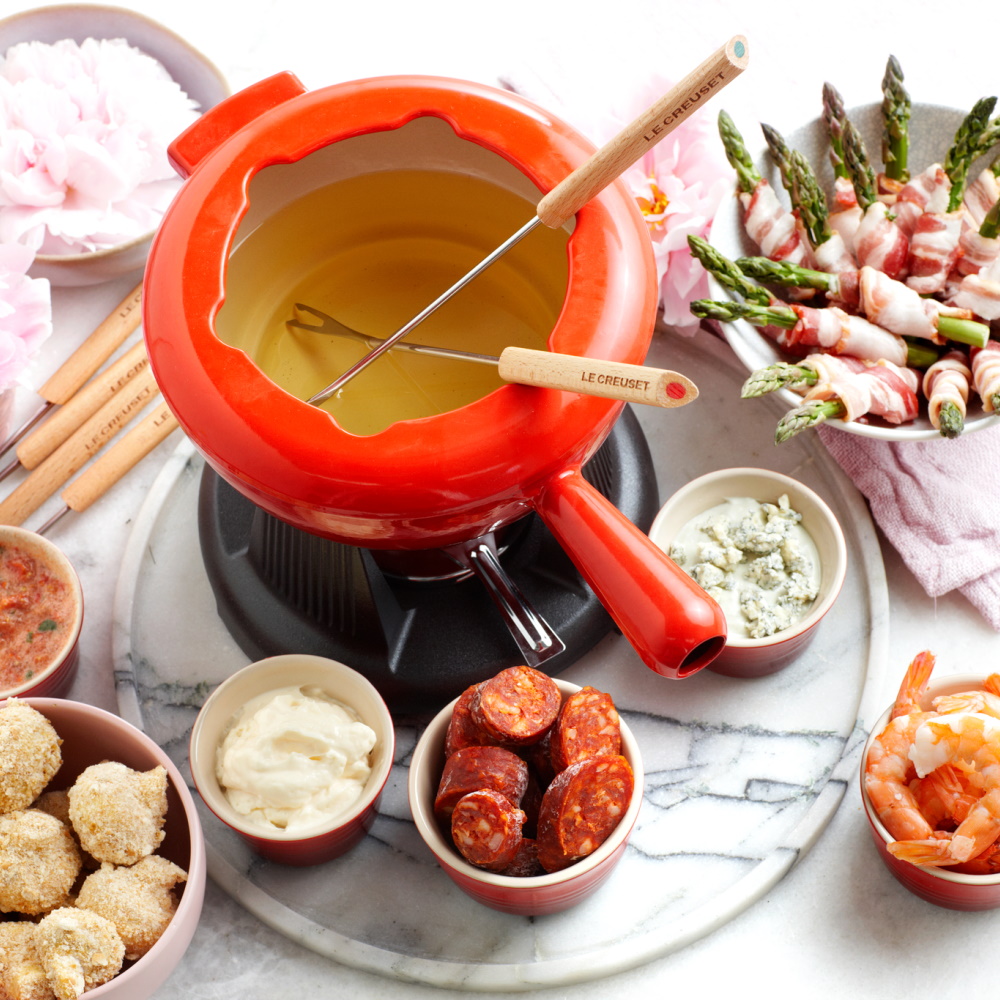 Pour un moment convivial en famille ou entre amis, offrez une soirée fondue avec ce service à fondue en fonte émaillée de la marque Le Creuset. Que ce soit une fondue au fromage, au chocolat ou façon Bourguignonne, ce service à fondue qui comprend un caquelon avec 2 poignées, un réchaud, six fourchettes, une protection anti-éclaboussures et un livret de recettes, est parfait.