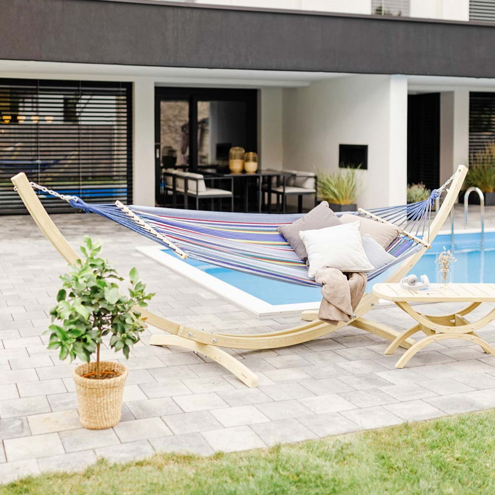Laissez-vous bercer par cet élégant hamac et son support en épicéa de la marque Amazonas. Le hamac résiste parfaitement aux intempéries et aux rayons UV grâce à sa certification ELLTex (ExtraLongLastingTEXtile). Vous serez aussi charmé par sa déclinaison de couleur façon Océan.