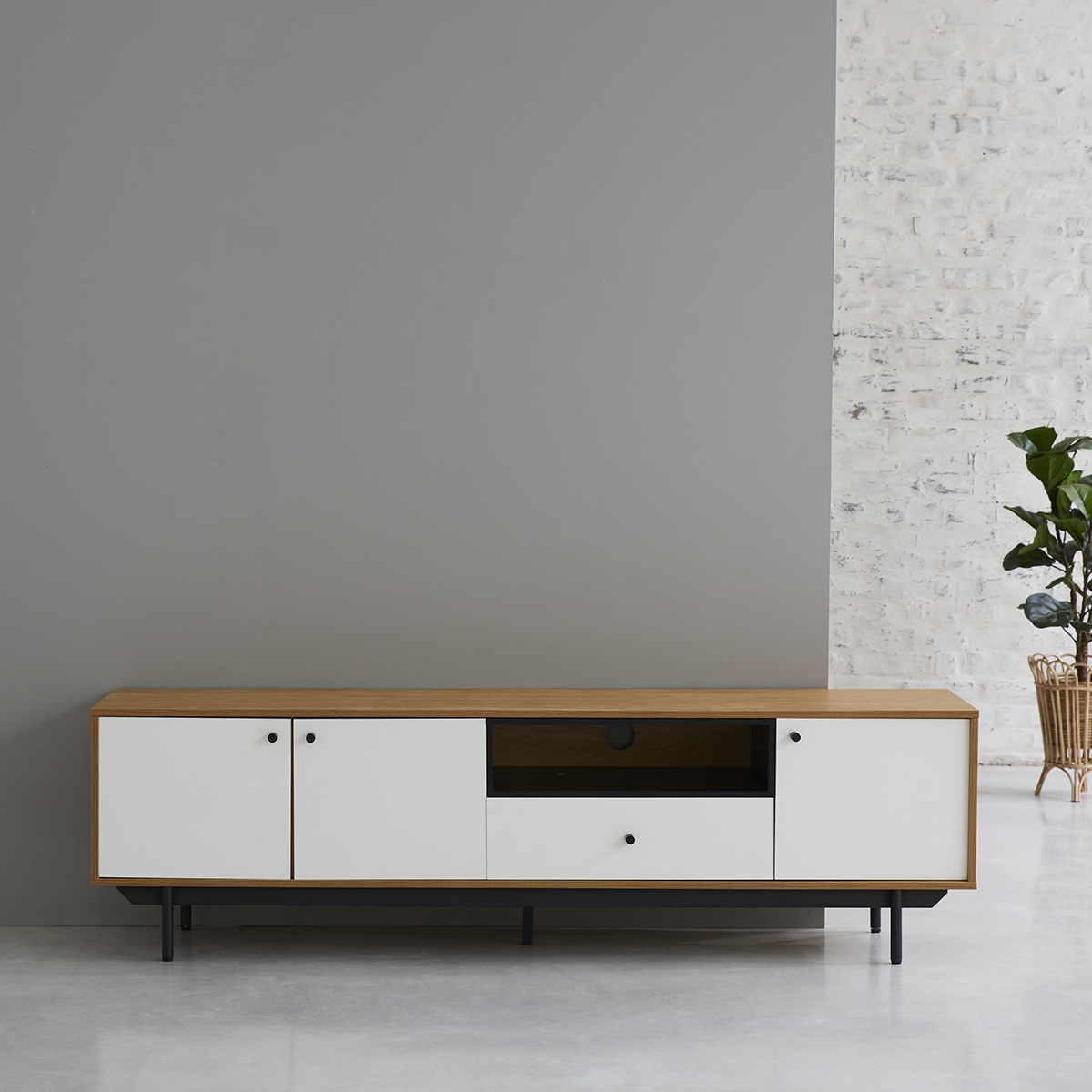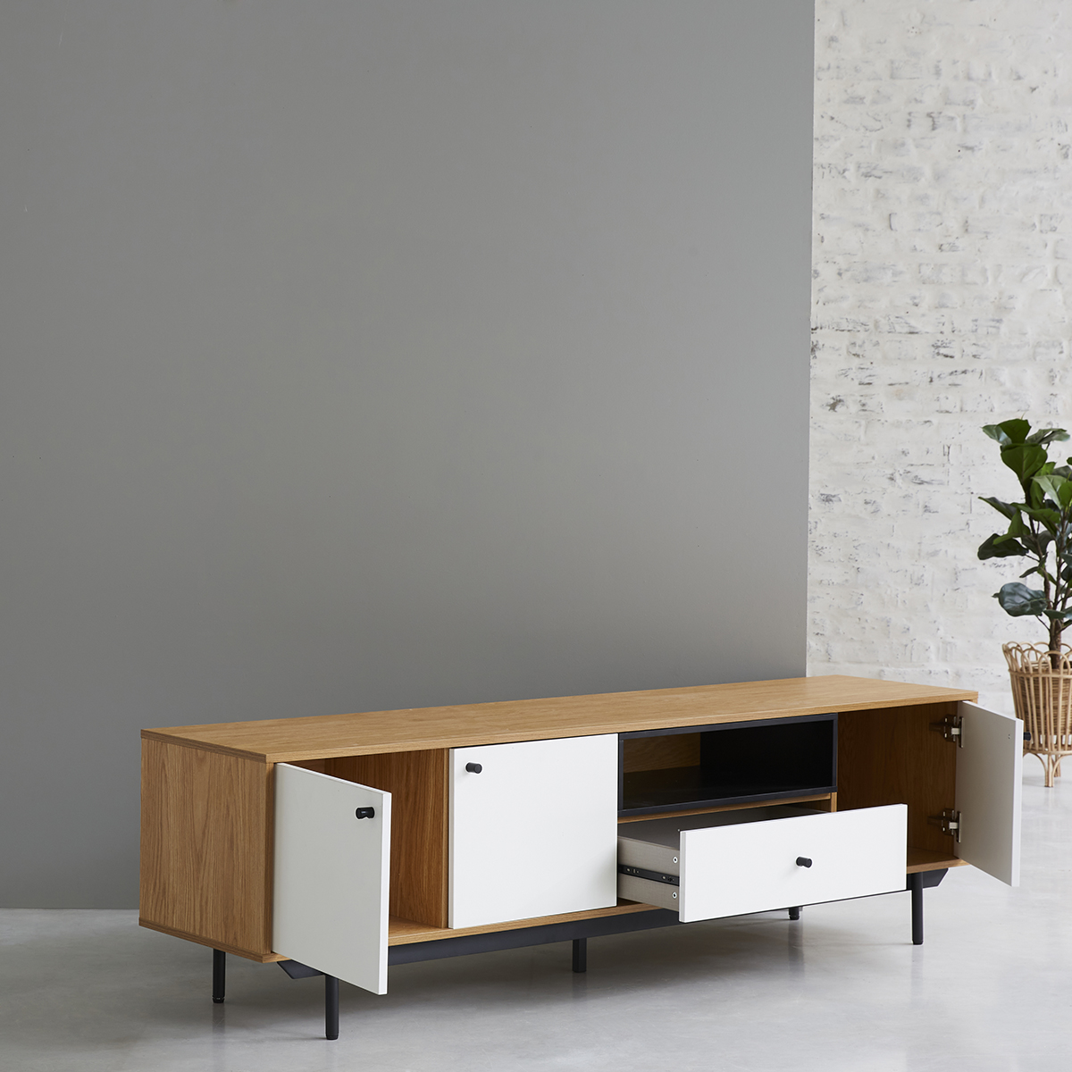 Composé de 3 placards, d'une niche ouverte et d'un tiroir, on adore ses pieds en métal, sa grande taille et ses nombreux rangements !