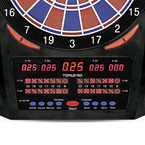 Cette cible électronique qui permet de jouer jusqu'à 8 personnes dispose d'une cible LCD et des effets sonores français. De plus, elle propose 40 jeux dont 761 variations.