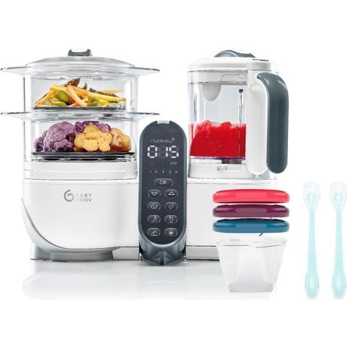 Le robot culinaire pour bébé Nutribaby(+) de BABYMOOV est l'incontournable pour des repas variés et savoureux ! Il permet de cuire et mixer simultanément tous les aliments : fruits et légumes, viande, poisson, œuf, céréales, féculents.