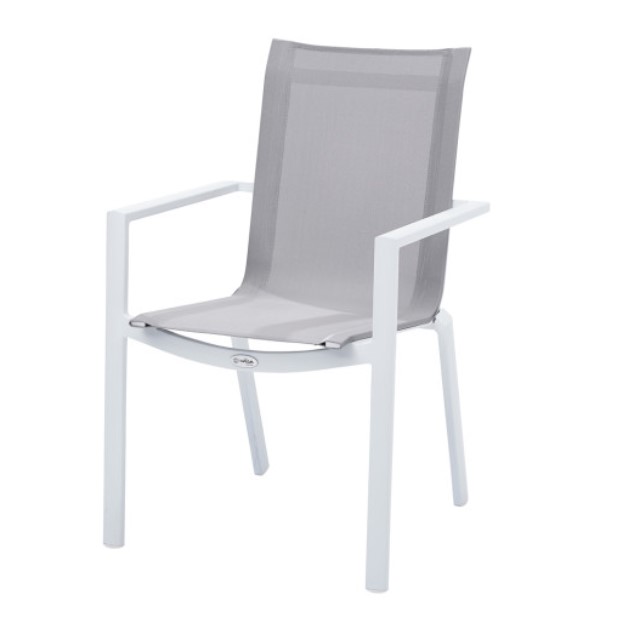 Comfort and elegance for this magnificent armchair with its Pearl Gray textilene seat. Practical, the armchairs are stackable and the textilene seat dries quickly.