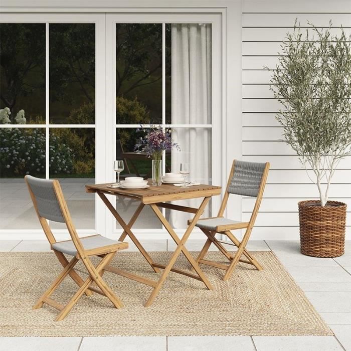 Le set bistro 2 places BARI, dans un chic coloris gris, ajoute une touche moderne à votre espace extérieur. Sa structure en bois d’acacia FSC et son revêtement en corde grise allient élégance et durabilité. Avec des dimensions compactes pour les chaises (43 x 59 x 86 cm) et la table (70 x 70 x 73 cm), ce set est parfait pour les petits espaces extérieurs.