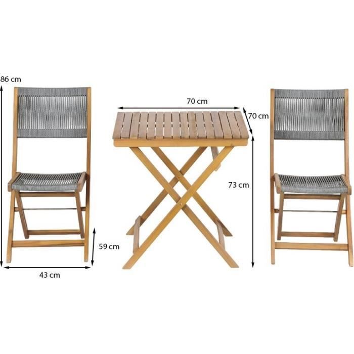 Ensemble repas en bois d’acacia FSC et corde gris : Dimensions chaises : 43 x 59 x 86 cm / Dimensions table : 70 x 70 x 73 cm