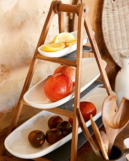 Élégante et design cette étagère en bois avec ses coupelles en porcelaine de Villeroy & Boch.Le set est composé de :1 x étagère 1 x coupe à fruits 1 x plat à baguette 1 x coupe à olives