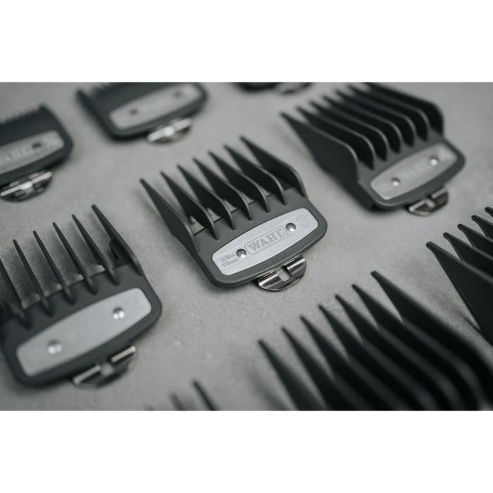 Fonctions spéciales Lame de précision Premium (1 mm-3 mm) : meilleure lame auto-affûtante. Sa vitesse de coupe est 40 % plus élevée que celle des lames de précision Wahl. Idéale pour dégradés. Moteur Wahl Elite : moteur le plus puissant, 15 % de plus que les moteurs Wahl Premium PowerDrive. Un maximum de performances pour des coupes régulières sur tous types de cheveux. 10 guides de coupe Secure-Fit™ assurent 10 longueurs de coupe de 1.5 mm à 25 mm. Idéal pour coupes très courtes et longues.