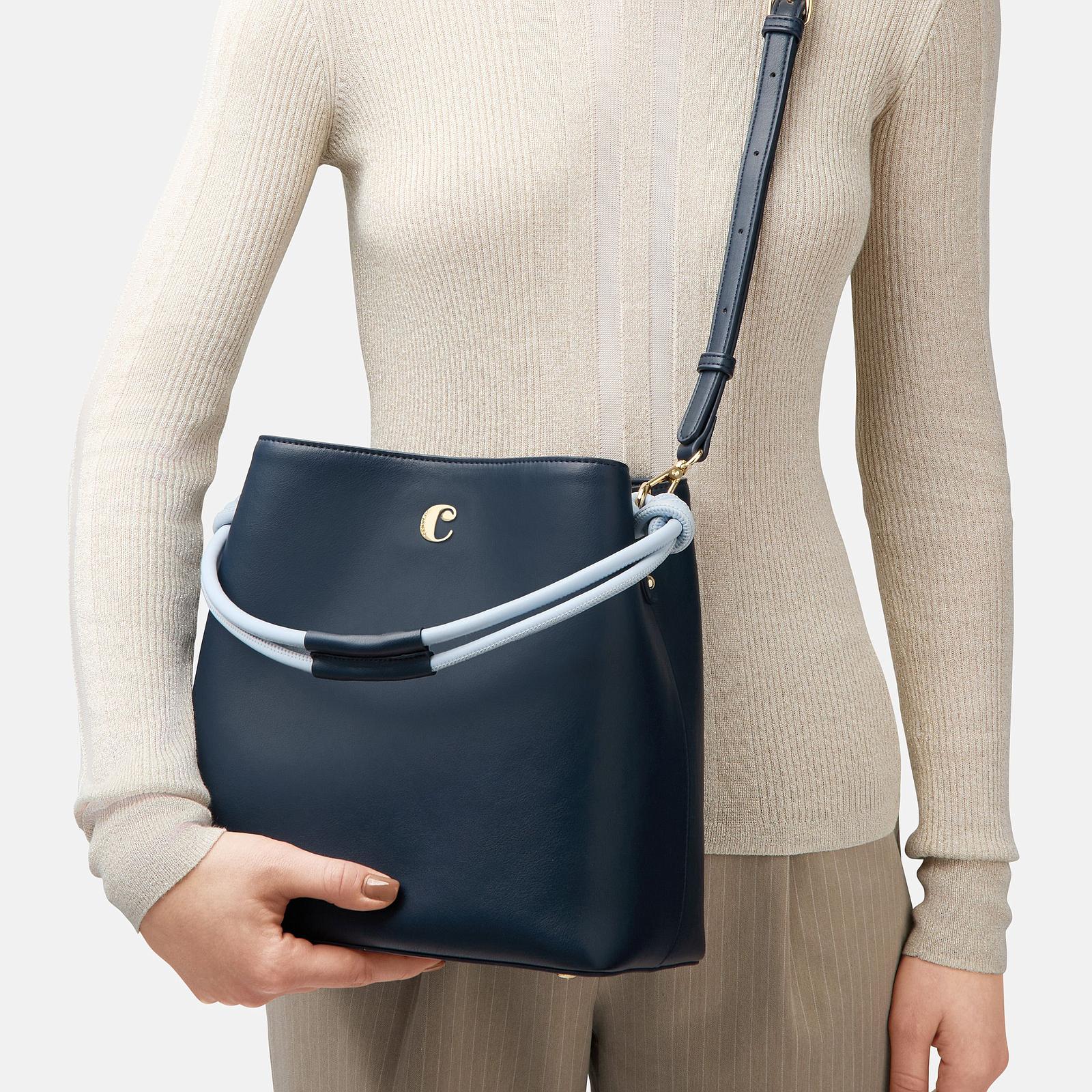 Laissez-vous séduire par ce sac seau bleu marine Cacharel, une création raffinée  qui incarne à la perfection le mariage entre modernité, féminité et praticité. Pensé pour la femme contemporaine, ce sac seau au design épuré est bien plus qu’un simple accessoire : c’est une déclaration de style. Sa silhouette structurée en similicuir vegan mat offre une allure sophistiquée, sublimée par une poignée en forme de nœud bleu clair, véritable signature visuelle. Le logo “C” doré sur le devant et la signature Cacharel au dos ajoutent une touche de luxe discrète.