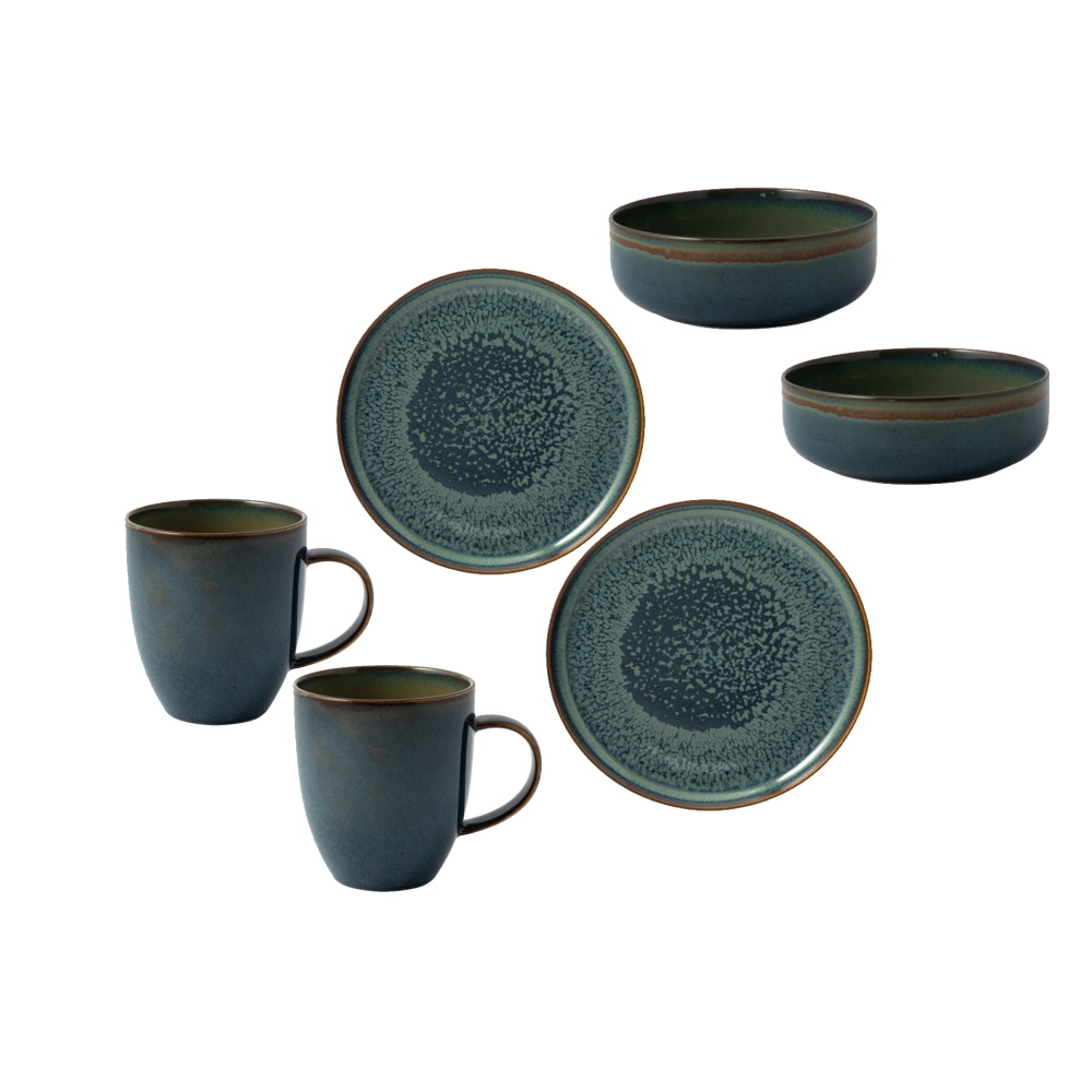 Ce ravissant set petit-déjeuner en porcelaine de la marque Villeroy & Boch apportera une touche d'élégance à votre petit-déjeuner, de quoi bien commencer la journée. Grâce à un émail réactif spécial, chaque pièce de ce set est unique. Ce set comprend pièces en tout dont 2 assiettes à dessert, 2 bols à céréales et deux tasses.