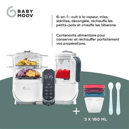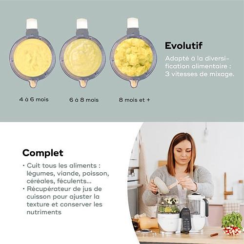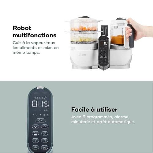 Le robot culinaire pour bébé Nutribaby(+) de BABYMOOV est l'incontournable pour des repas variés et savoureux ! Il permet de cuire et mixer simultanément tous les aliments : fruits et légumes, viande, poisson, œuf, céréales, féculents.