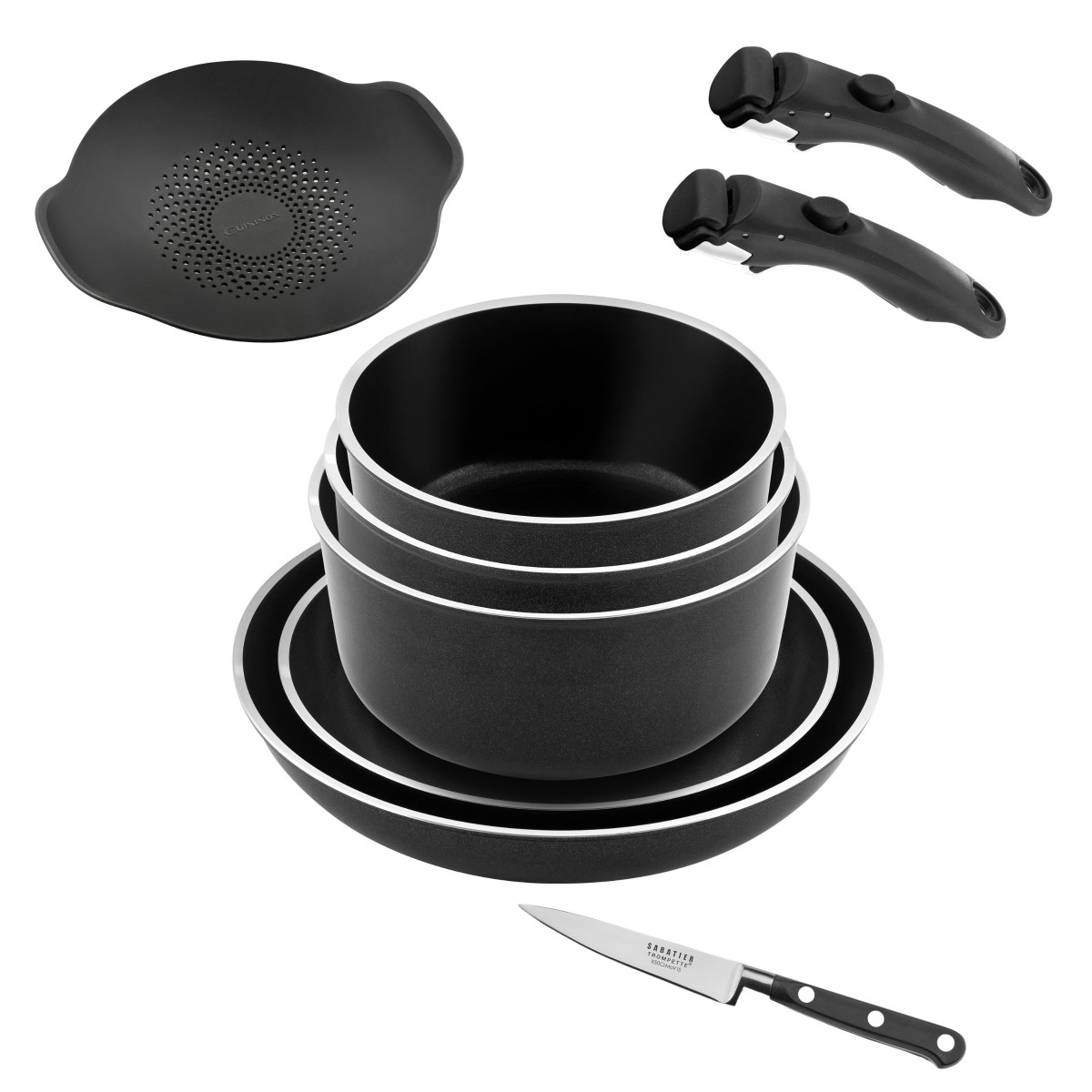 3 casseroles 16/18/20 cm, 2 poêles 24/28 cm, 1 couvercle anti débordement, 2 poignées, 1 couteau d'office