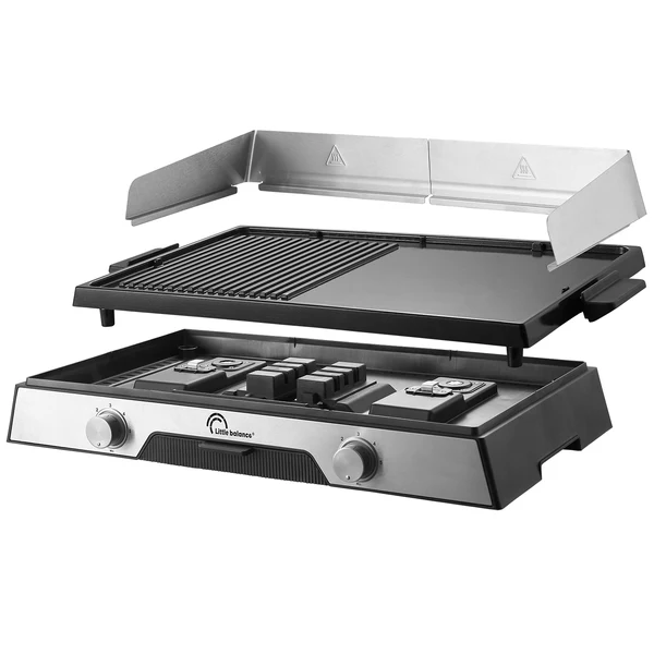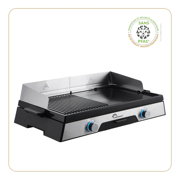 Montée en température ultra rapide, en moins de 15 minutes (jusqu'à 250°C), grâce à ses 2 résistances serpentins couvrant chaque zone de cuisson - Bavette aluminium anti-projections et coupe vent