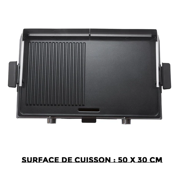 Plancha électrique professionnelle, avec 2 zones de chauffe indépendantes : 1 plancha + 1 grill, 2 thermostats indépendants : Pour saisir viandes, brochettes, poissons, crustacés d'un côté, griller légumes, pommes de terre, ou fruits de l'autre, adaptez simplement le thermostat de la zone de chauffe (Jusqu'à 250°C), pour des cuissons adaptées et toujours réussies !