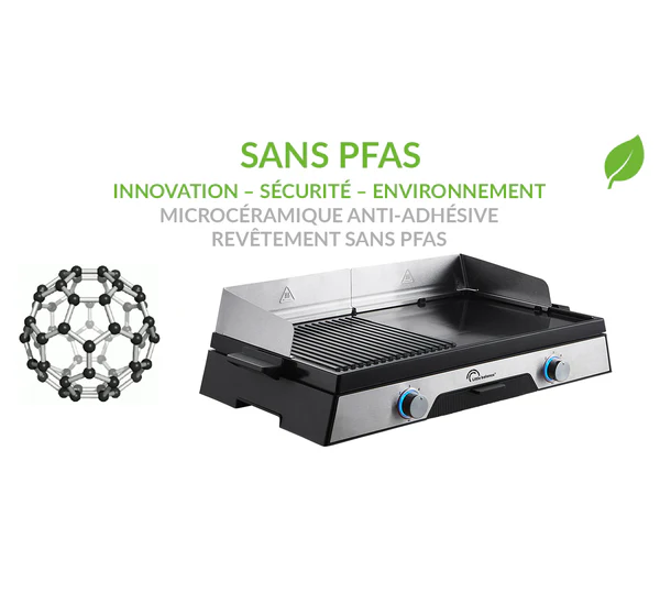 Zones de cuisson en fonte d'aluminium, avec un revêtement antiadhésif microcéramique, sans PFAS : C'est mieux pour l'utilisateur et plus écologique pour l'environnement (plus de polluants éternels). Pour cuisiner de façon saine et équilibrée, sans ajout de matière grasses - Idéal pour les grandes familles, ou entre amis : 6 à 10 personnes