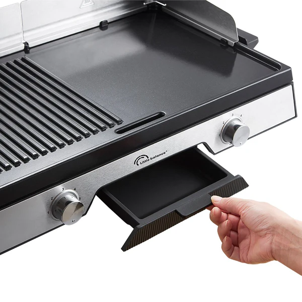 Caisson ultra résistant dans le temps, même dehors (Norme IPX4) - Evacuation des graisses et restes dans son bac à jus amovible, compatible lave vaisselle - Plaque et résistances spécialement adaptées pour un nettoyage au lave-vaisselle