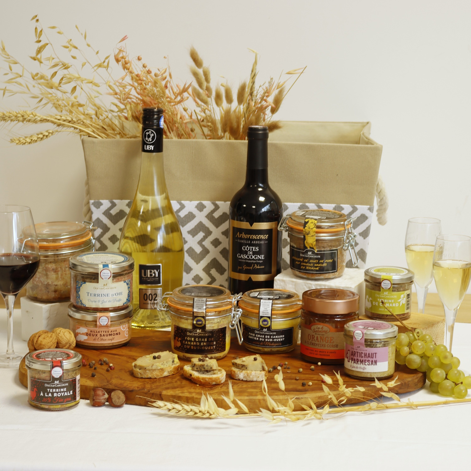 Dans une petite lingère en coton à rayures grises, élégante et authentique, se cache un trésor de gourmandises façonnées par le savoir-faire des Ducs de Gascogne. Ce coffret est une invitation au voyage sensoriel, entre traditions culinaires et plaisirs raffinés.