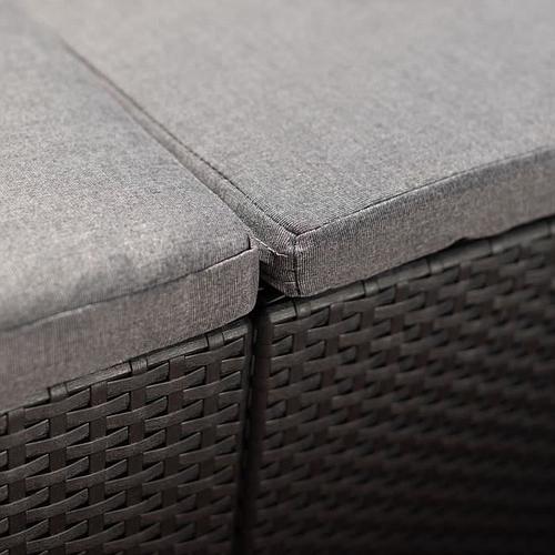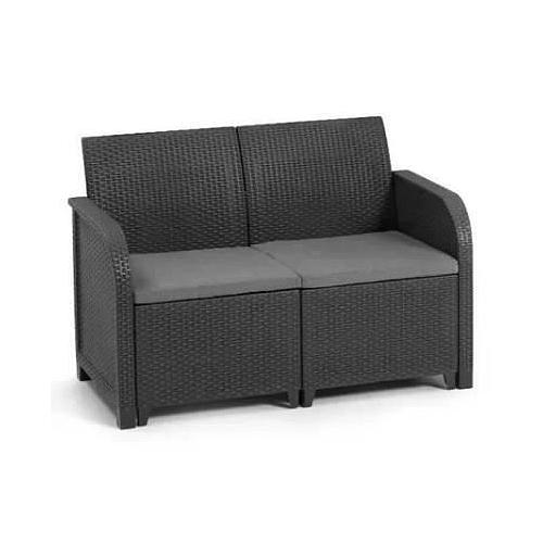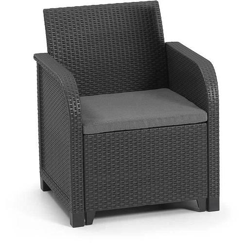 Cet agréable salon de jardin de couleur gris foncé, en résine injectée, se compose d'une agréable banquette 2 places, de deux fauteuils et d'une table basse. Ce produit comporte les coussins et dispose de dossiers ergonomiques, ce qui le rendra confortable.